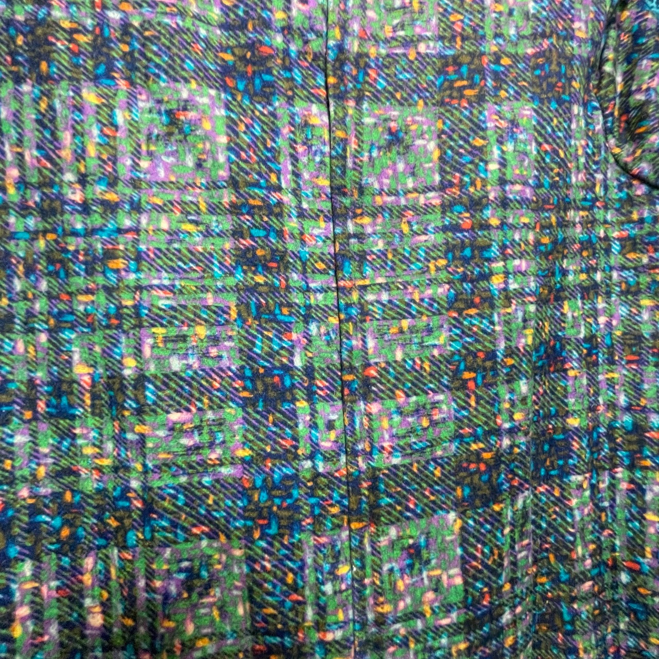 グリーン、パープル、ブルー、オレンジ、イエローなど様々な色が織り込まれており、見ているだけでも楽しくなるような、レトロでモダンな雰囲気漂う一着です。