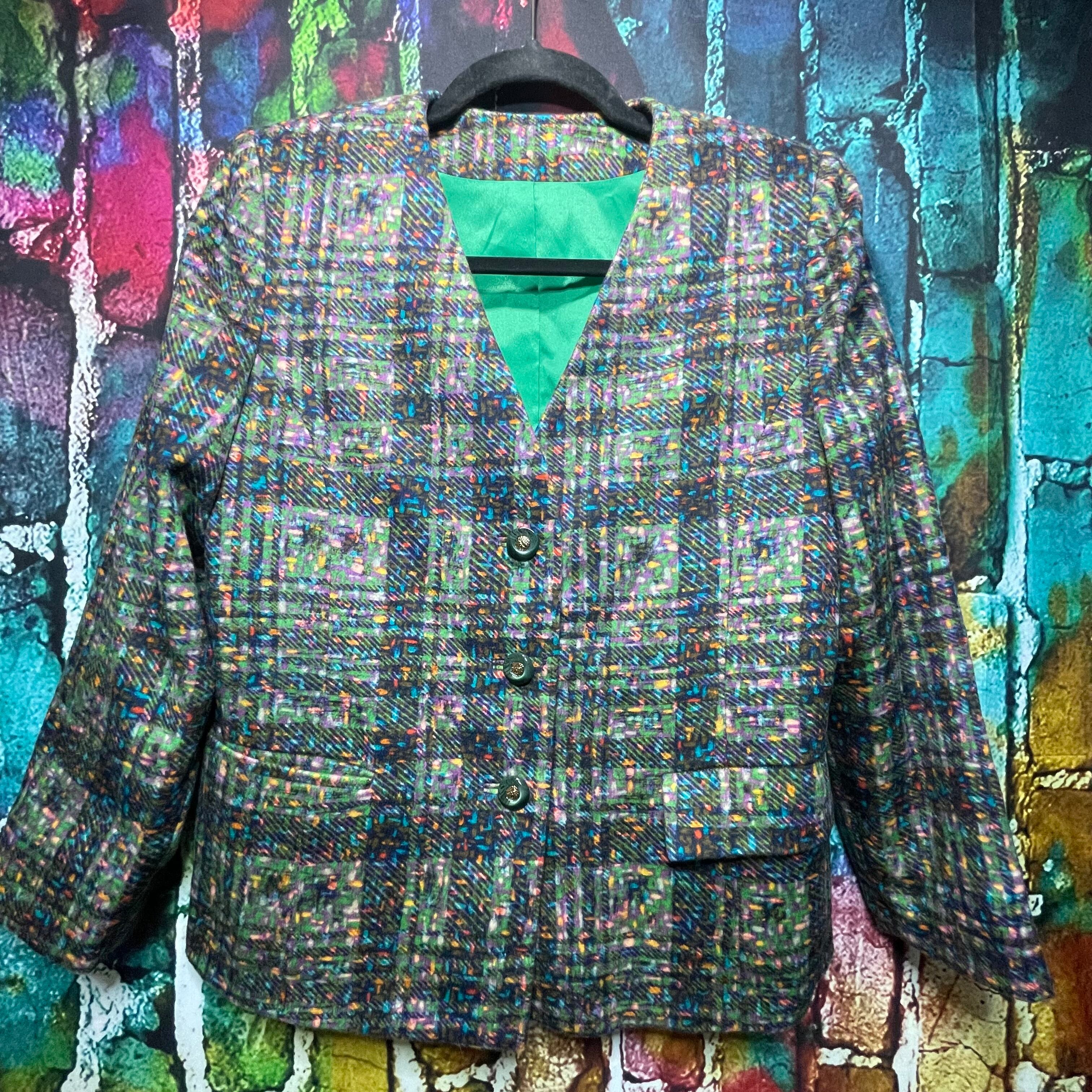 個性的な色使いが魅力のツイード素材のセットアップ(ジャケットとワンピース)です。